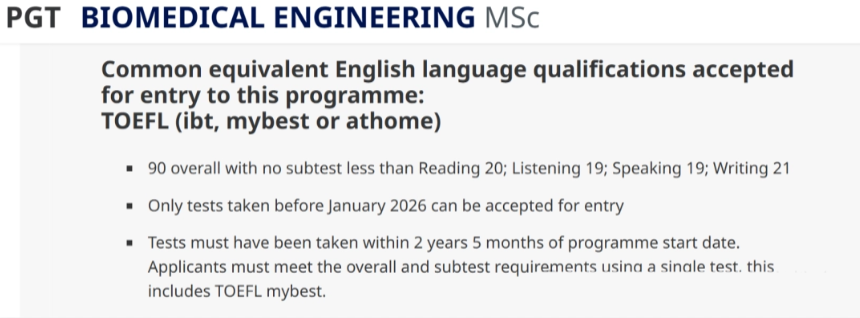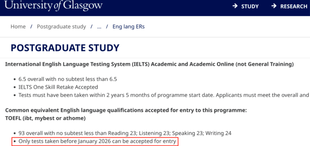 随后,格拉斯哥大学部分研究生专业明确将托福成绩的认可范围限定在2026年1月之前考取的分数,这一规定实质上等同于不接受改革后的新托福。
