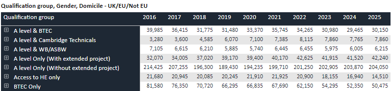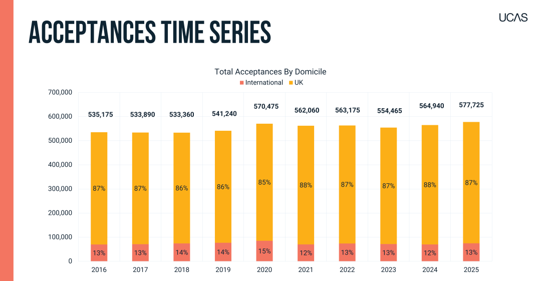 2024-2025申请季,UCAS申请人数为759,830人,共有577,725人被录取,整体录取率26.7%。