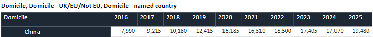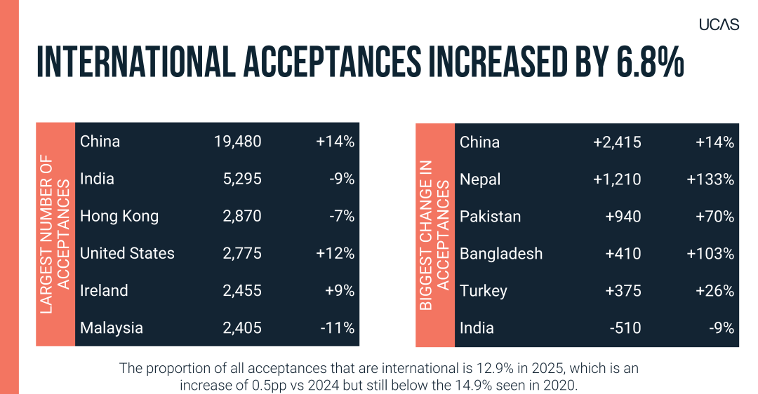 2025年入学季共有759,830人通过UCAS系统递交了申请,其中国际学生有154,145人,中国大陆学生申请人数为36,385人。中国大陆地区依然是申请数量最多的海外生源地。