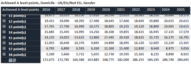 A-Level成绩证书仍旧是最主要的申请证书,提供A-Level+EPQ的申请人数为42,240人,提供A-Level但无EPQ的申请人204,050人;用IB成绩申请的人数4,240人。