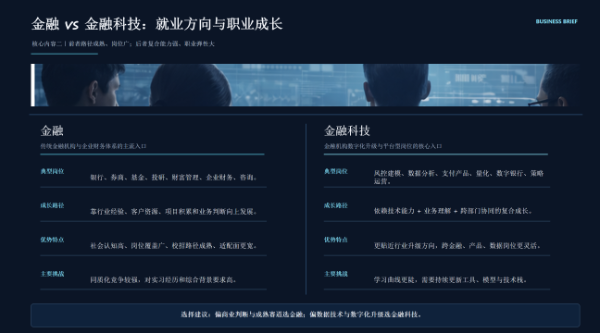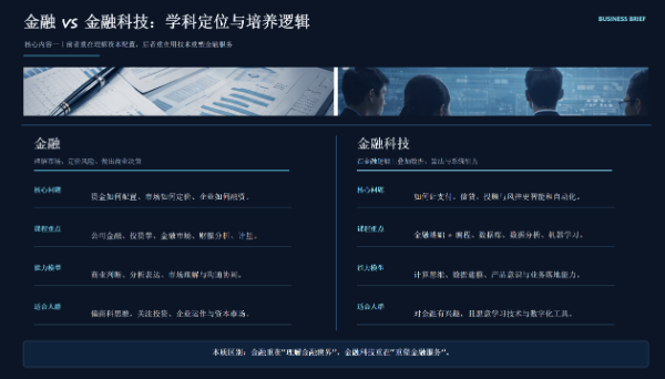 一句话定调: 金融是“商科里的老钱”,重逻辑与分析;金融科技是“商科里的极客”,重技术与落地。