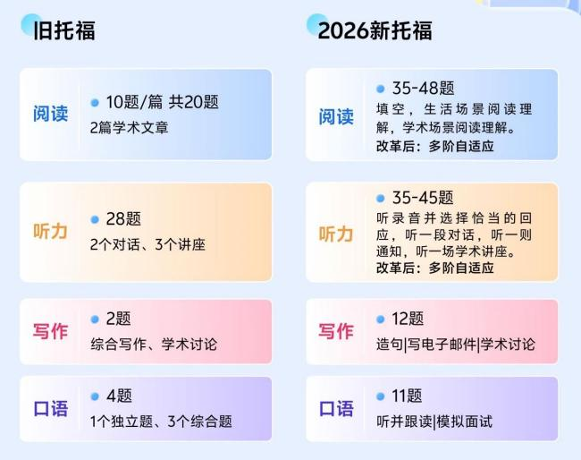 托福阅读:旧托福共20题(10题/篇)2篇学术文章,新托福34-48题,新增传记类文章,同时加入填空、生活场景阅读理解等题型,学术类话题减少,生活 / 职场类话题(如环保、人工智能)占比提升,更贴近日常应用。