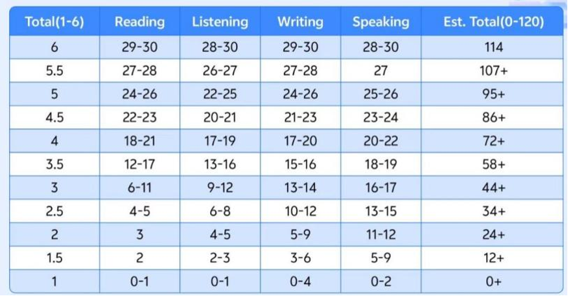 托福6分制按听、说、读、写四科平均分计算,严格遵循“四舍五入”原则。比如,6分对应阅读29-30分、听力28-30分、写作29-30分、口语28-30分,换算成120分制就是114分;5分对应95+分,4分对应72+分。