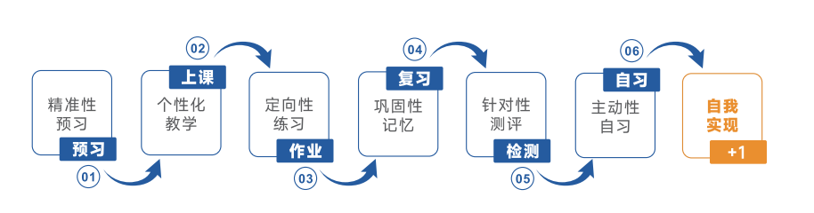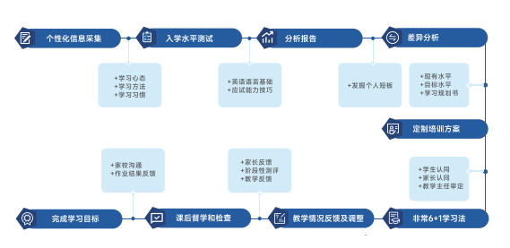 9+1服务体系,全方位督学:从个性化信息采集、入学水平测试,到成绩分析报告、定制培训方案,再到课后督学、学情反馈,形成“非常6+1学习法”(上课、复习、自习、测评、预习、作业+自我检测),确保每一步学习都扎实有效。