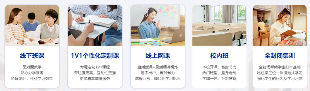 新航道课程涵盖多种班型,上课形式多样,线上/线下课程/大班/小班/一对一课程应有尽有,满足不同学员需求。别再让时间和地点绊住你学习的脚步!