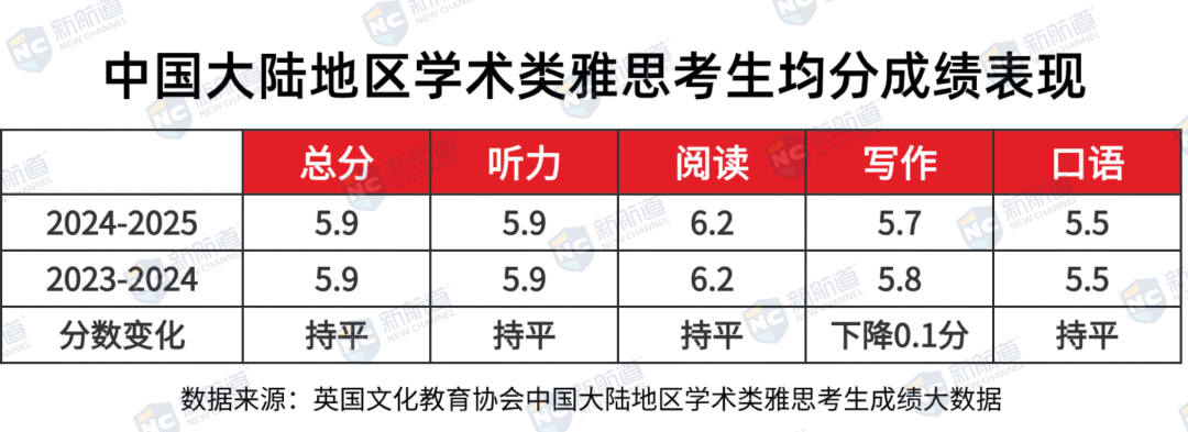 2024–2025年度,中国大陆地区学术类雅思考生成绩总体表现保持稳定,整体均分为 5.9 分,与去年持平。