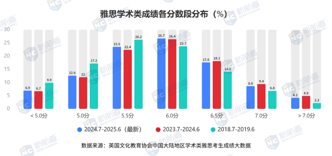 上图表展示了近三个阶段(2018–2019、2023–2024、2024–2025)中国大陆学术类雅思考生成绩在各分数段的占比情况。由此我们可以看到,6.0 分段依旧是主力区间,5.5 分与 6.5 分梯队紧随其后。高分段(7.0 分及以上)考生比例保持在个位数水平,说明高分竞争依旧集中于少数考生群体。