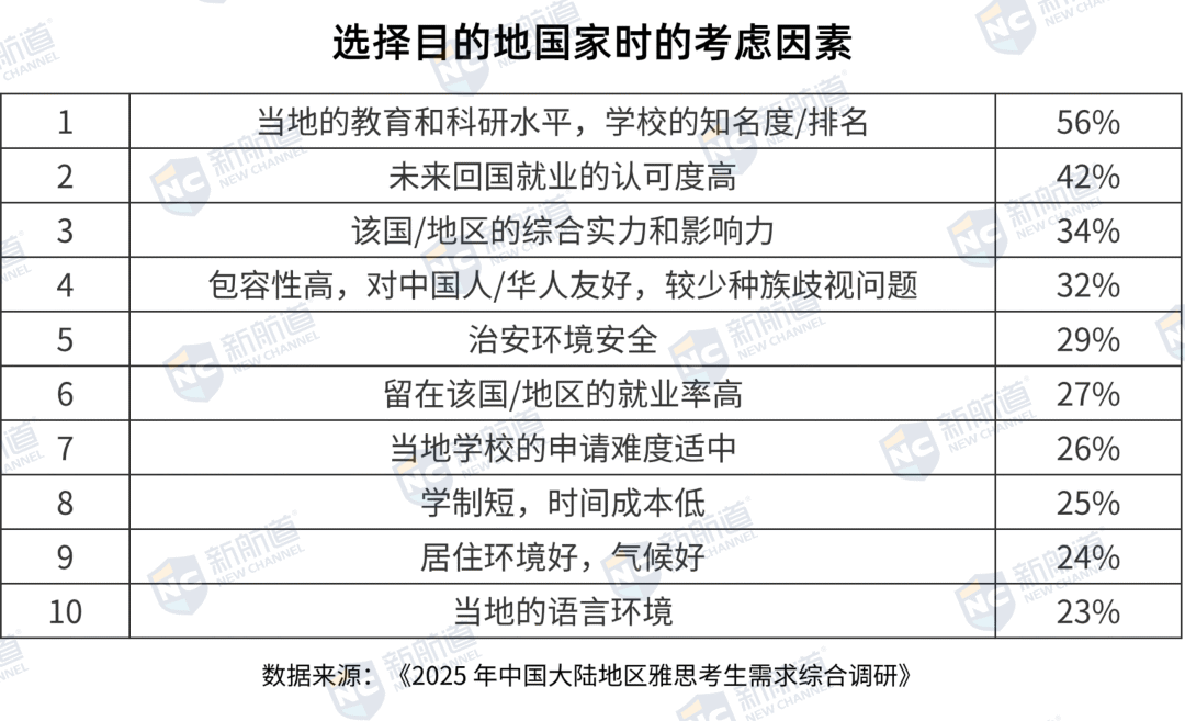 报告数据显示,中国大陆地区考生在选择留学目的地时,更加注重长期收益与整体匹配度。教育与科研水平仍是首要考虑,但回国就业认可度、安全与友好度、当地就业率等因素权重持续上升。留学不再只是“学术追求”,而逐渐成为职业规划的重要一步。