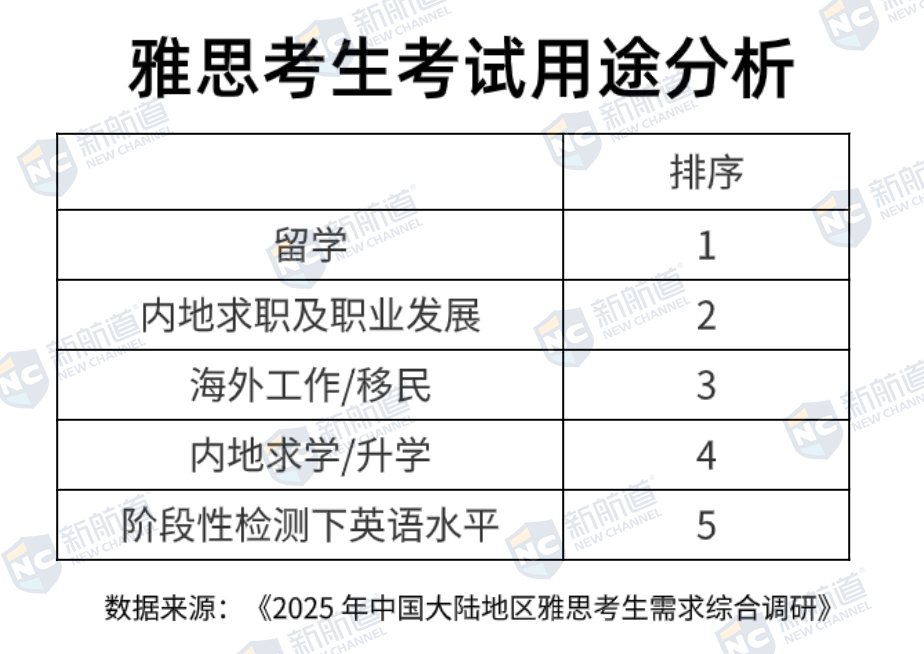 调研显示,“海外留学”仍是中国大陆考生报考雅思的首要目的,但职场用途快速上升——“内地求职及职业发展”已位列第二太卷了!国考也开始要求“雅思”了?近800岗位设门槛!。超过一半的职场受访者表示,在面试、晋升或海外业务中被要求提供雅思成绩从外企到体制内“通吃”!雅思成绩正在成为体制内晋升‘必备项’!。