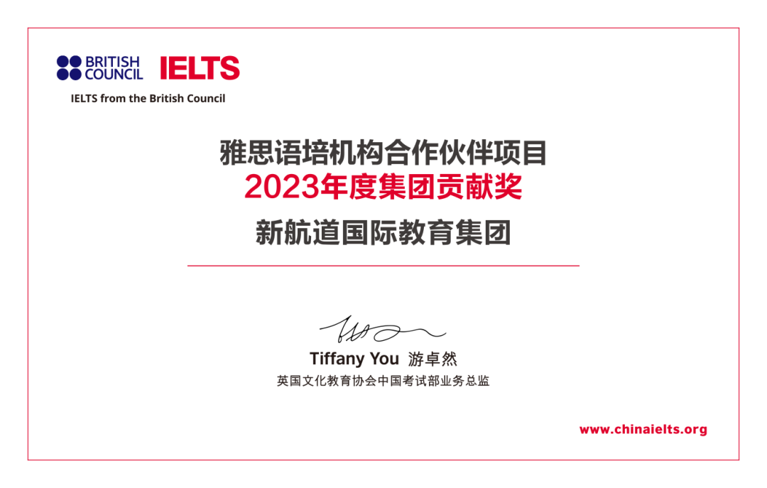 2024年2月5日,在英国文化教育协会发布的雅思官方合作伙伴评级中,新航道集团及旗下分校共获得15项官方荣誉,其中3所分校荣膺白金级合作伙伴称号。因在雅思考生培养与考试服务方面的突出贡献,新航道荣获雅思官方颁发的“集团贡献奖”。