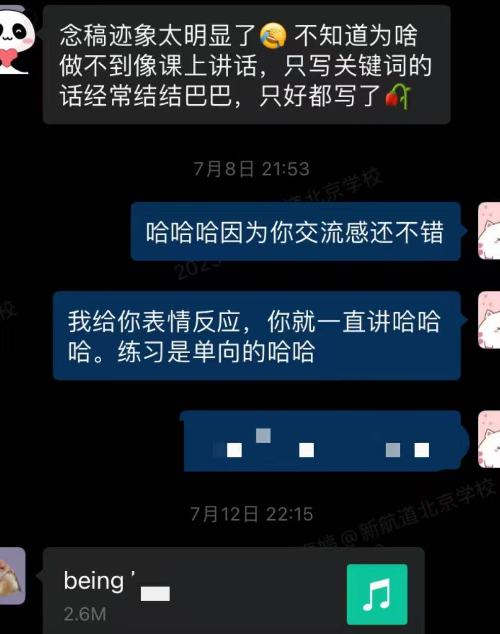 口语学习中“勇于开口练习”至关重要,这也是我常鼓励学员做到的。课堂上,这位学员积极参与对话,在老师的引导下了解常考话题、积累相关语料,高效提升交流感。课后,她认真完成录音作业,采纳老师的批改建议,每天规律地进行口语练习。通过这样的持续练习,她的口语水平有了明显提高,也增强了用英语交流的信心,这正是口语提分的核心路径。