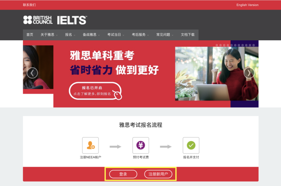 登录雅思官方报名网址,新用户进入页面后,先点击右下方“注册新用户”; 之前注册过账号的考生可直接“登录”。