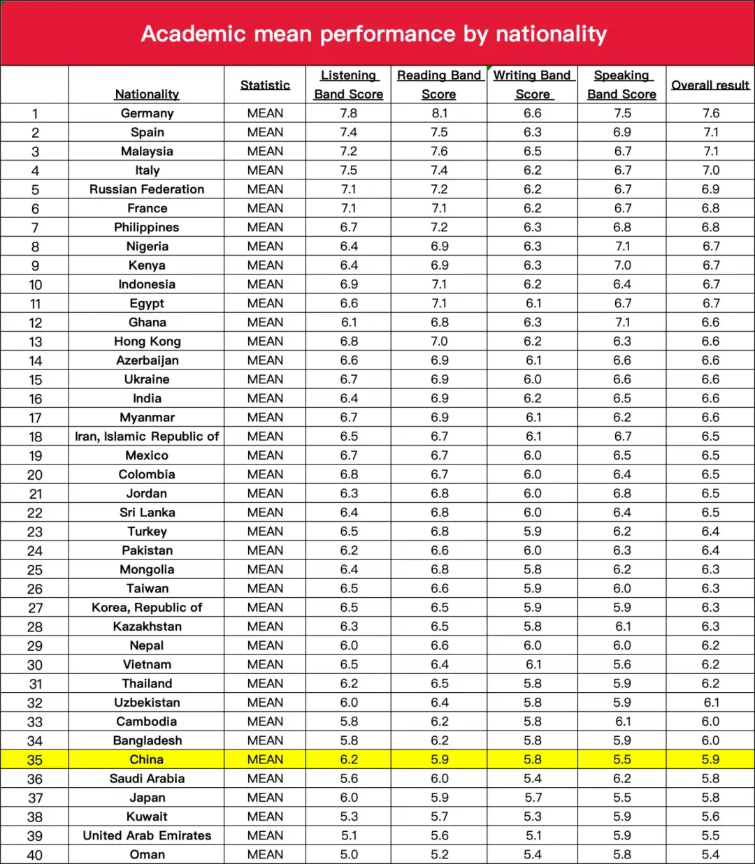 根据报告显示,全球雅思考试(A类)考生均分的是德国,雅思均分为7.6分。