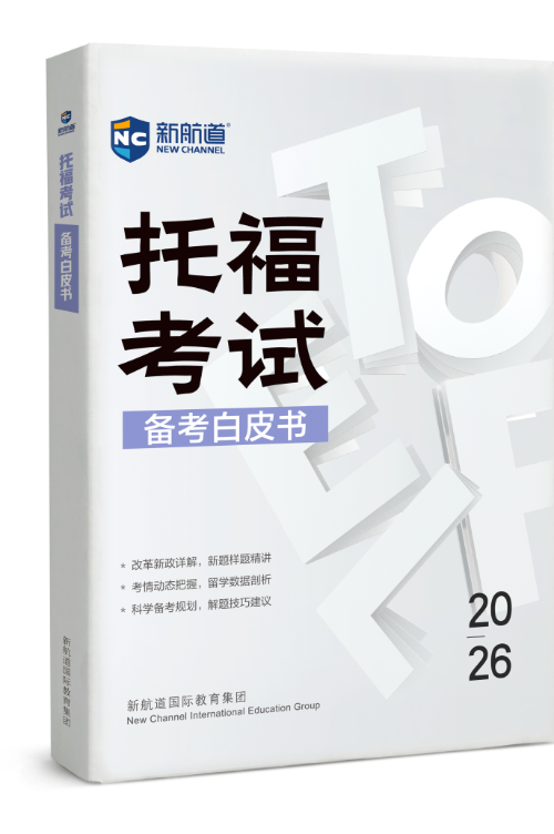 2026《托福考试备考白皮书》作为一本托福考生必备的斩托指南,于12月22日与广大托福考生见面。此书根据ETS、美国门户开放网站等官方发布数据全面分析全球托福考生情况,并邀请新航道托福教学团队针对托福改革内容以及解析改革后的OPT样题,助力考生突破瓶颈,掌握改革后的决胜关键。