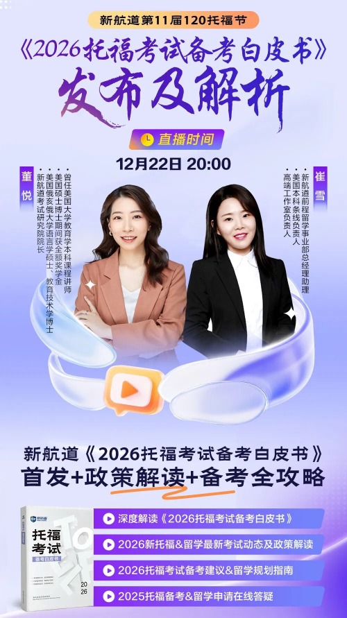备考托福?我们有大招!新航道考试研究院院长、新航道前程留学事业部总经理助理共同为你深度解读2026《托福考试备考白皮书》、揭示新托福备考的种种技巧和新趋势,助你在托福考场上游刃有余。