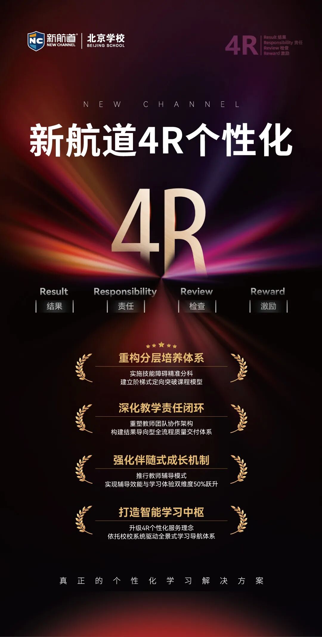 4R个性化课堂:4R代表着Result (结果)、Responsibility (责任)、Review(检查)和Reward(激励)。四者有机结合,形成“以结果为起点,又以结果为归宿” 的科学、实用的系统。