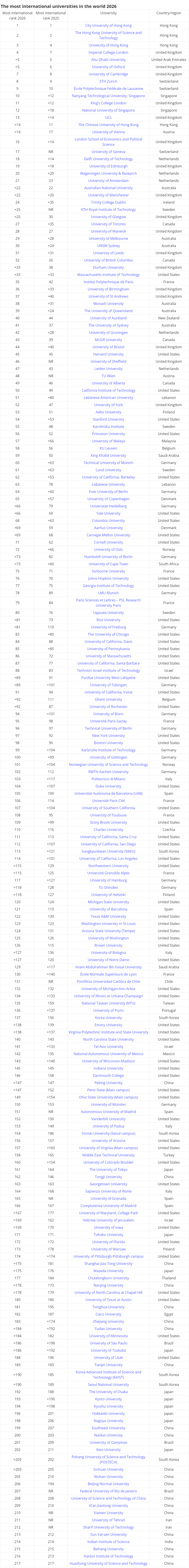 香港城市大学、香港大学、香港中文大学、香港理工大学 等院校通常稳居世界前10名,甚至包揽全球前3。